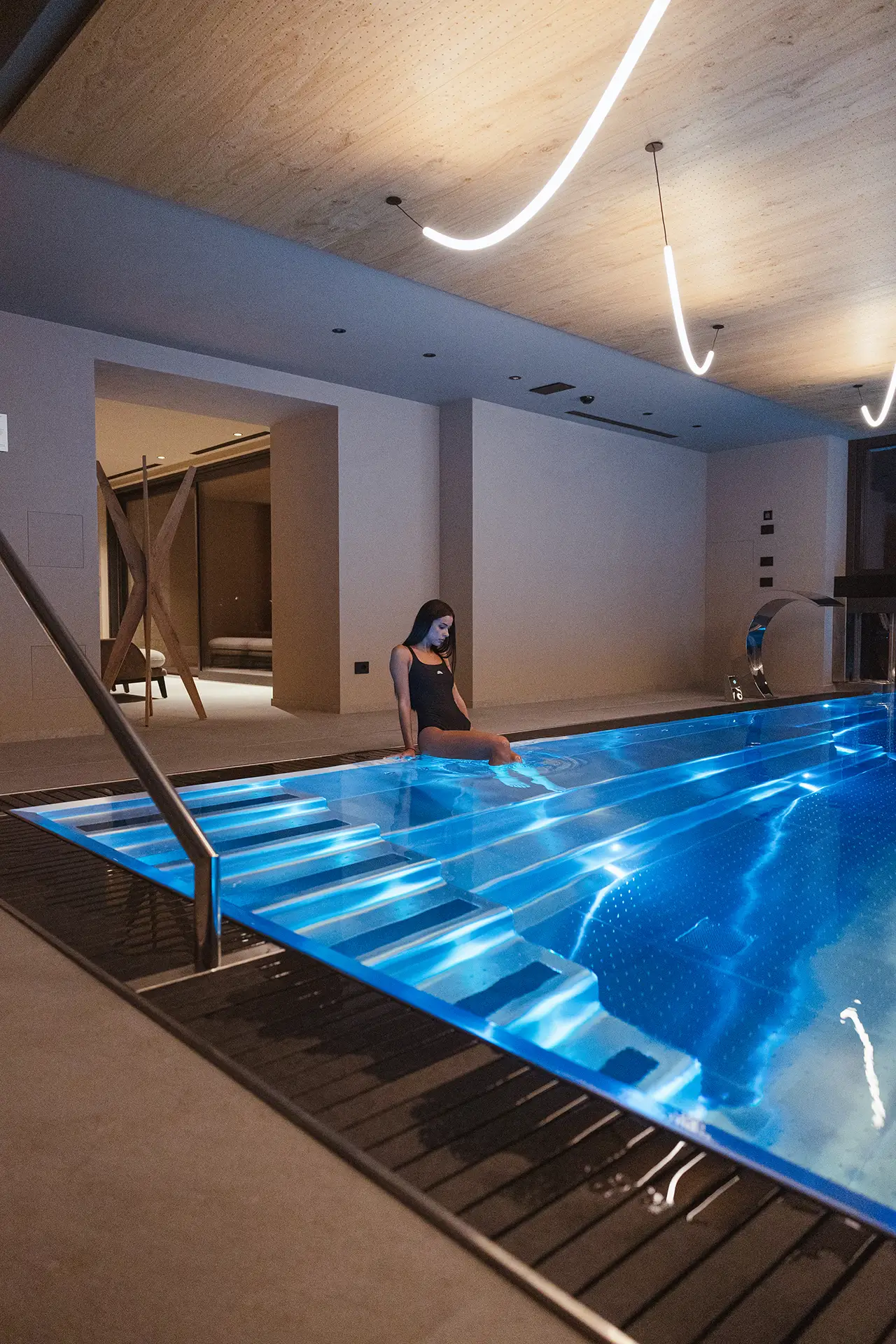 Grazie alle luminose vetrate, immergiti nella nostra piscina riscaldata e, uscendo all’esterno, goditi il panorama mozzafiato che si staglia davanti a te. Nuotando dall’interno verso l’esterno il tuo corpo si fonderà con la natura unitamente all tepore dell’acqua calda e alla freschezza dell’aria alpina.
